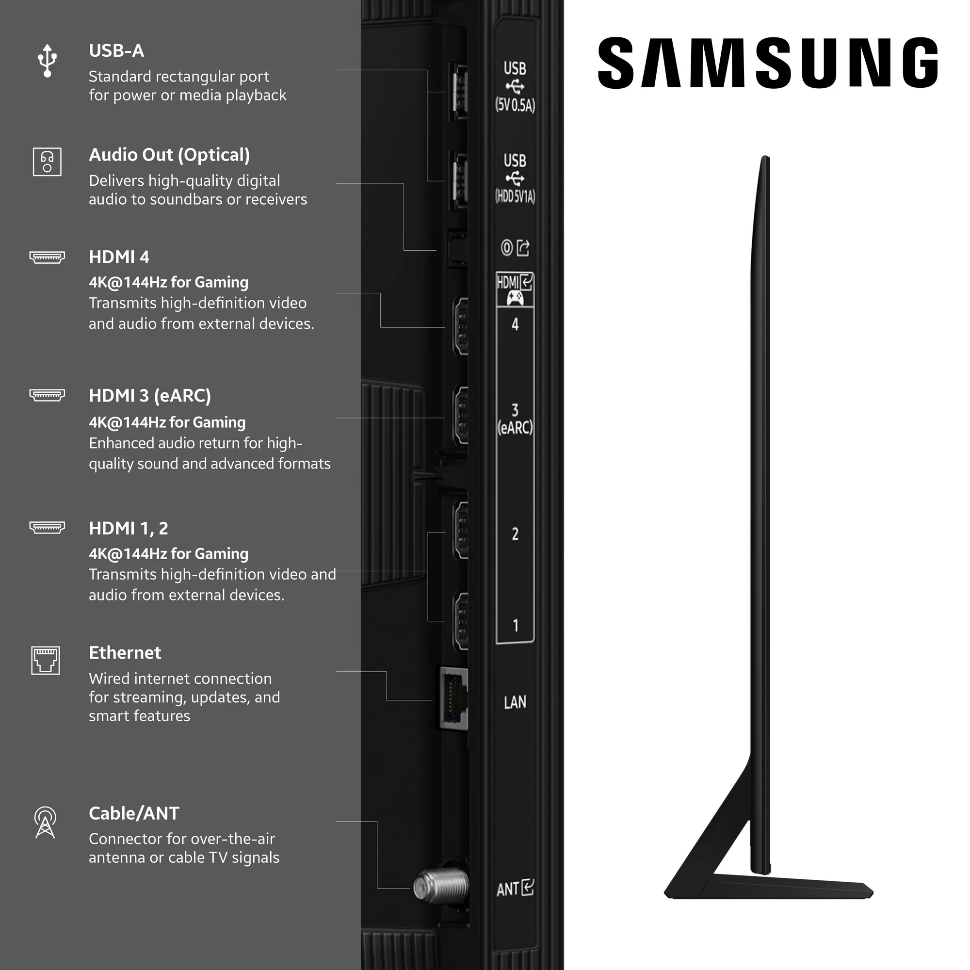 Black finish, Slim profile, Freestanding or VESA mount (400 × 400)