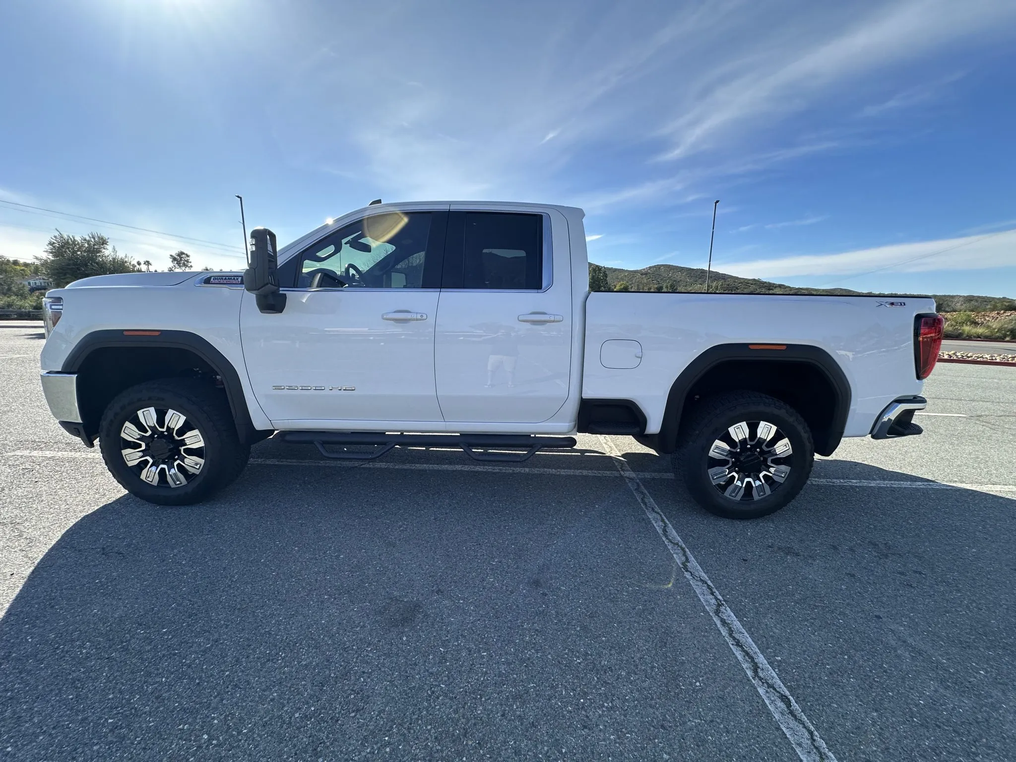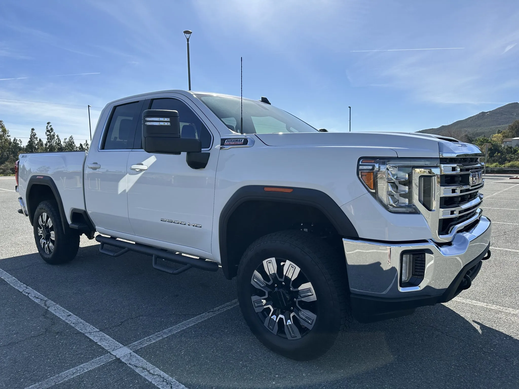Summit White paint, LED headlights, LED fog lights, Multipro tailgate, N-Fab nerf bars, Spray-on bedliner, Receiver hitch, Trailering mirrors