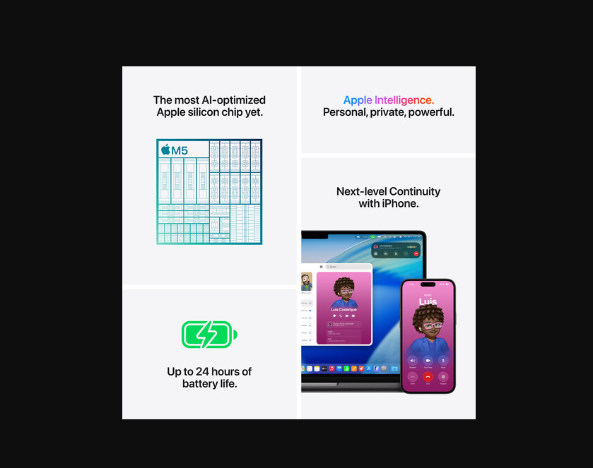 Now with the powerful M5 chip, the Apple 14" MacBook Pro delivers a huge leap in AI performance. The M5 chip features a next-generation 10-Core GPU with a Neural Accelerator in each core, delivering up to 3.5x the AI performance and up to 1.6x faster graphics than the previous generation. The M5 chip also includes a faster and more efficient CPU, an enhanced Neural Engine, and higher memory bandwidth that accelerates everything from launching apps to running large language models (LLMs) on device. The M5 chip also brings faster SSD performance than the previous generation for tasks, such as importing RAW image files or exporting videos. Additionally, it offers optimal battery life of up to 24 hours, so you can take your pro workflows anywhere. This Mac comes preloaded with macOS. Updates can be downloaded for free via the Mac App Store. Please check Apple's website for upgrade eligibility.