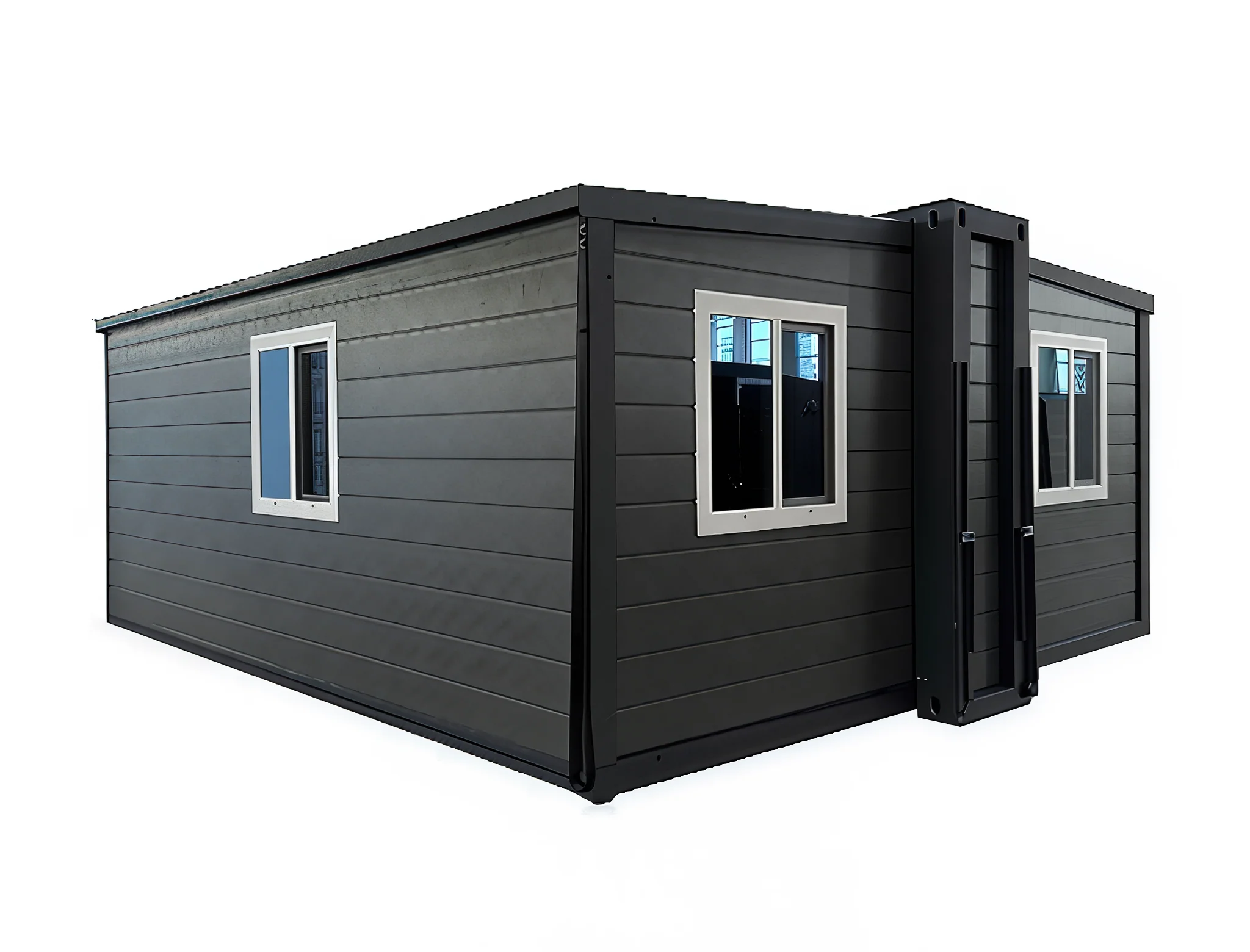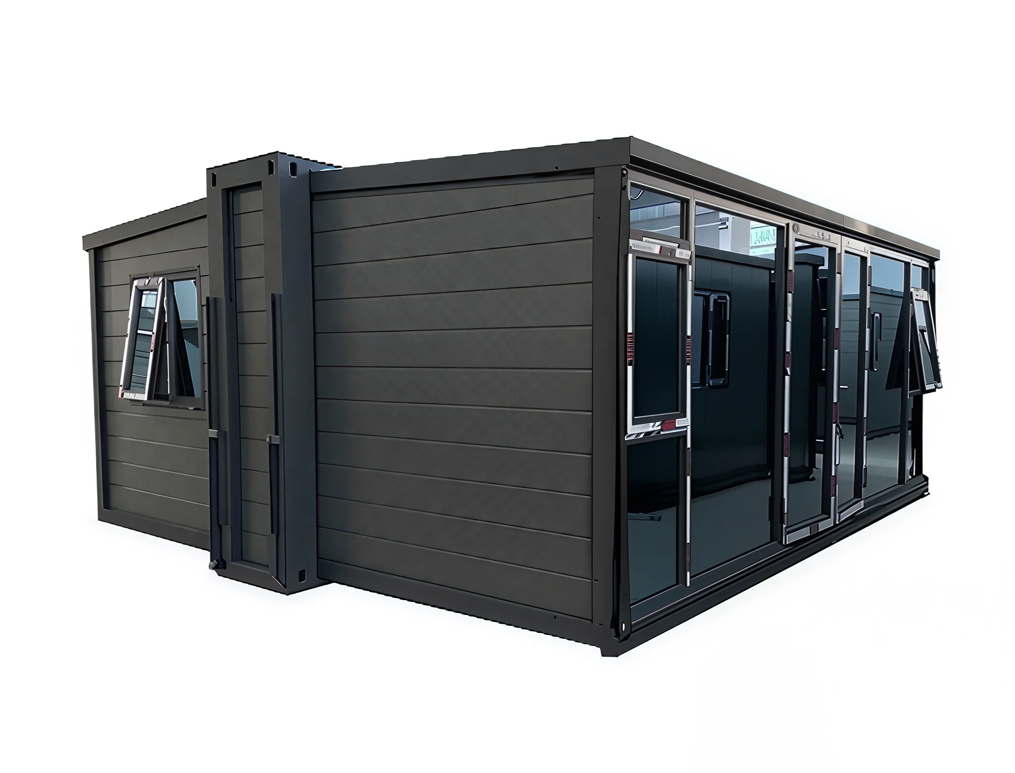 Container-based home with hydraulically expandable side rooms that triple the internal space at destination. Ships as a standard 40ft container and expands to a full 1-bedroom home on-site.