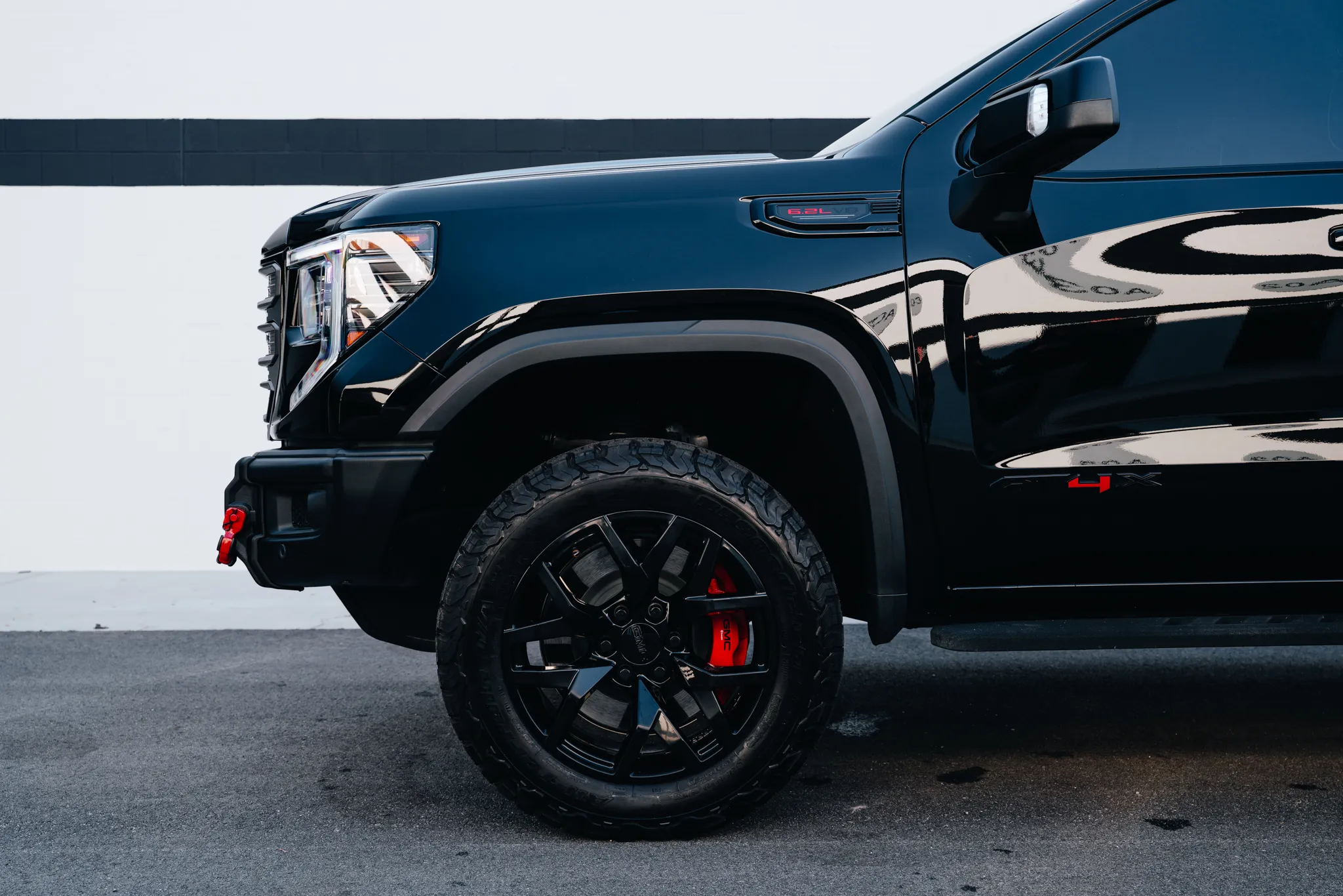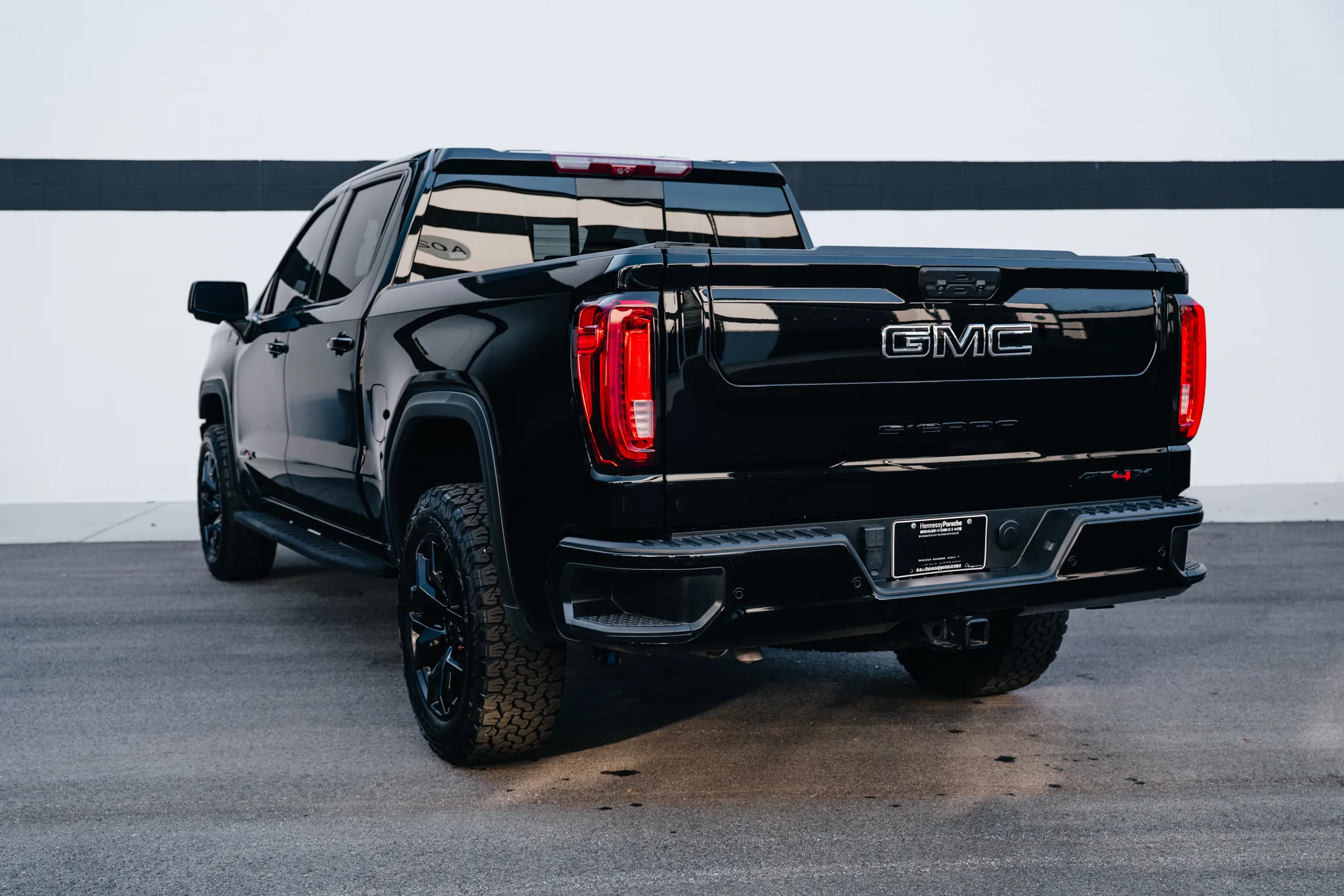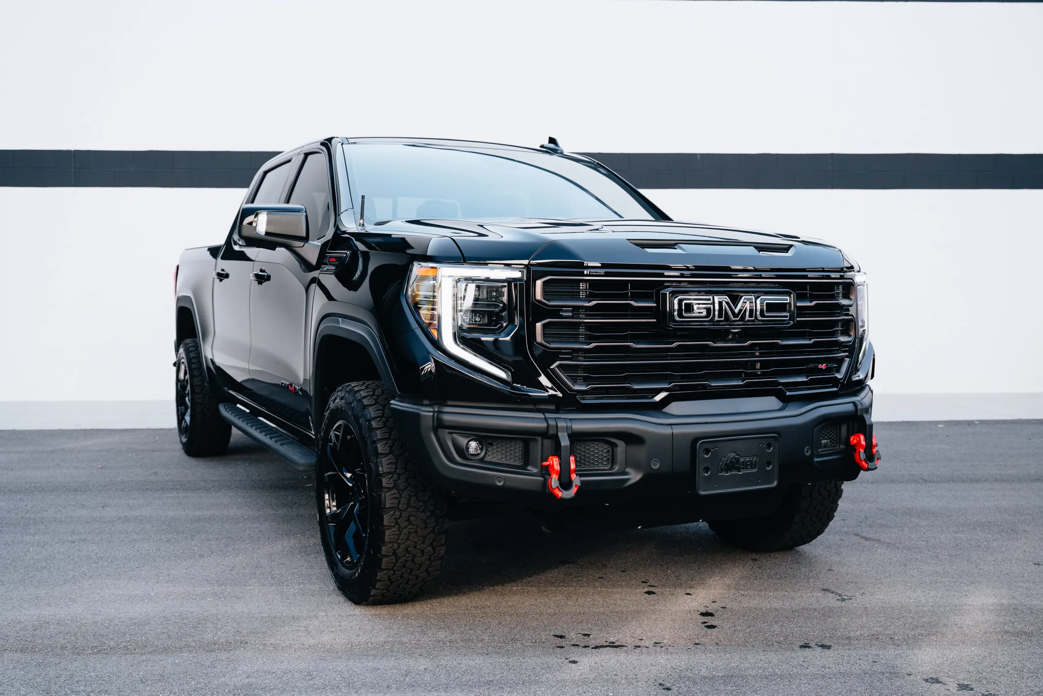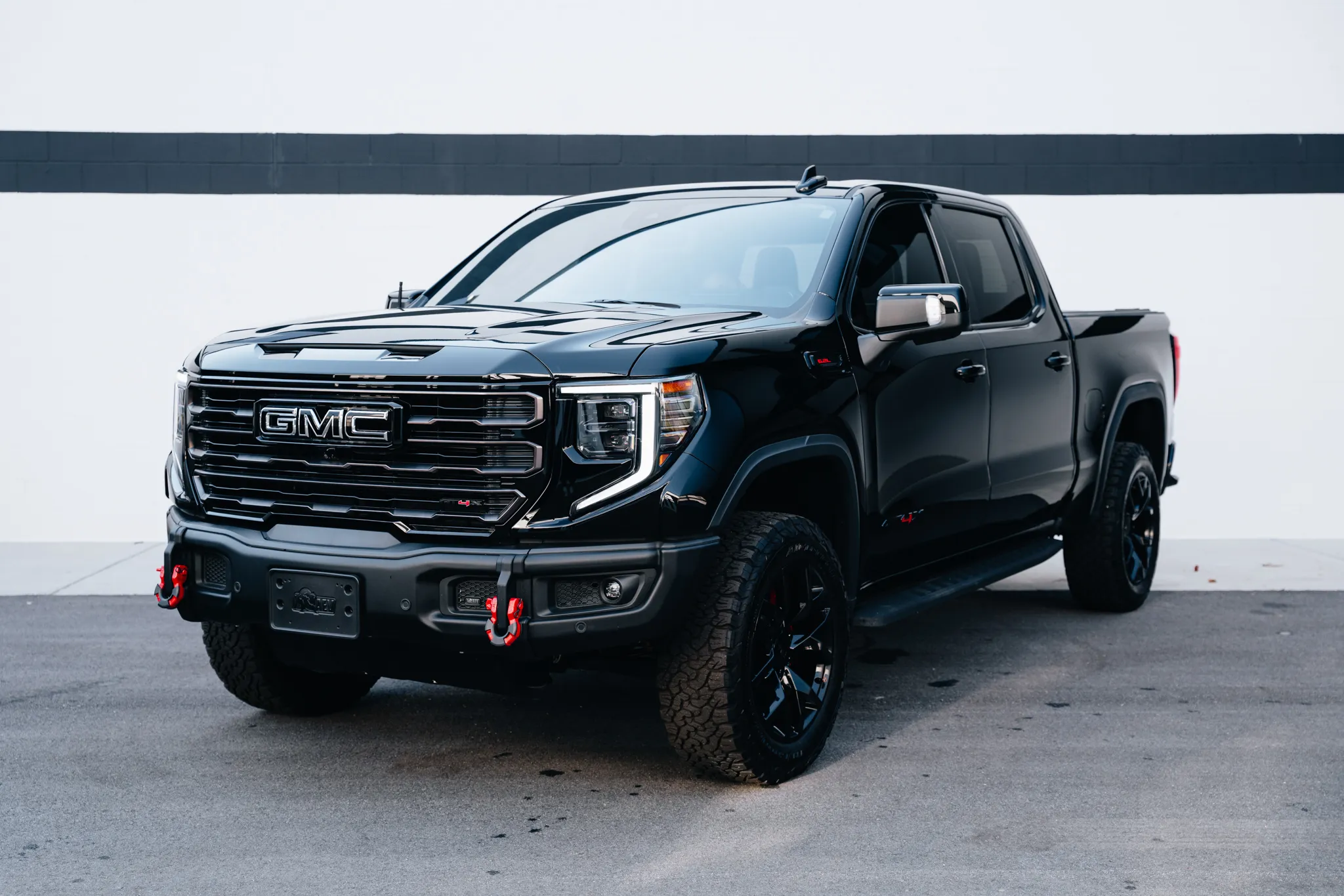 The 2023 GMC Sierra 1500 AT4X Crew Cab 4×4 is a rugged off-road pickup powered by a replacement 6.2L EcoTec3 V8 (420 hp, 460 lb-ft) paired with a 10-speed automatic, dual-range transfer case, and front/rear electronic locking differentials, featuring a Borla cat-back exhaust for enhanced performance. Finished in Onyx Black with Obsidian Rush leather, it includes off-road assist steps, an AEV front bumper, 20″ wheels, a MultiPro exterior Kicker Audio system, heated/ventilated seats, dual-zone climate control, and a premium Bose interior sound system for comfort and capability.