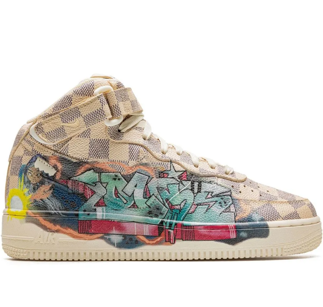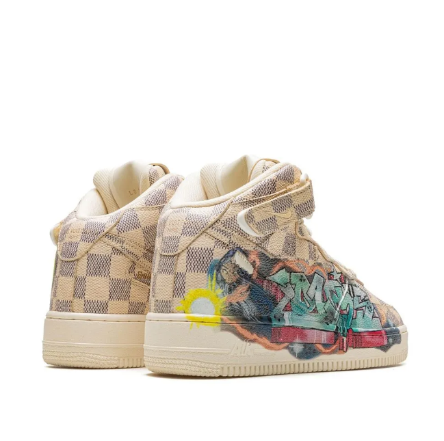 Nike x Louis Vuitton Air Force 1 Mid "Virgil Abloh - Graffiti" sneakers The Louis Vuitton x Nike Air Force 1 Mid "Graffiti" features a leather upper with a beige and brown checkerboard pattern. Its design stands out thanks to the multicoloured graffiti on the quarter panel - a work of the artist Ghusto Leone. This high-top sneaker is secured by a side touch strap at the ankle and is finished by a cream rubber sole.