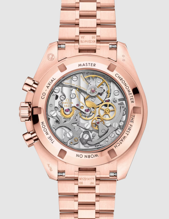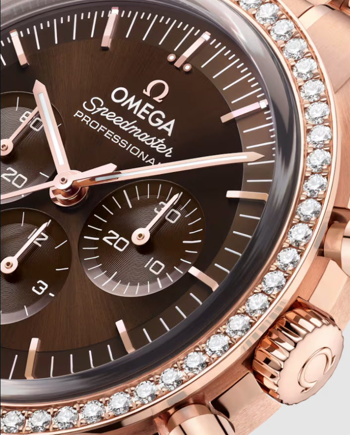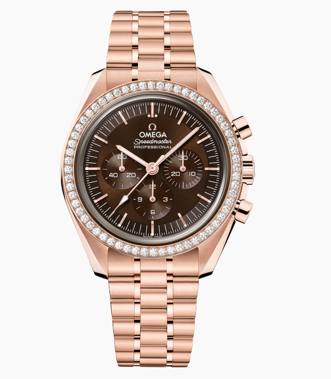 The Speedmaster Moonwatch is one of the world’s most iconic timepieces. Having been a part of all six moon landings, the legendary chronograph is an impressive representation of the brand’s adventurous pioneering spirit. Presented on a five-arched-links-per-row bracelet, this 42 mm Moonwatch in 18K Sedna™ Gold features sapphire crystal glass on the front as well as on the caseback. Inspired by the 4th generation Speedmaster style worn on the moon, it also includes a brown step dial and an asymmetrical case with diamond-paved bezel. The watch is driven by the OMEGA Co-Axial Master Chronometer Calibre 3861, which powers the small seconds sub-dial, 30-minute recorder and 12-hour recorder, along with the central chronograph function.