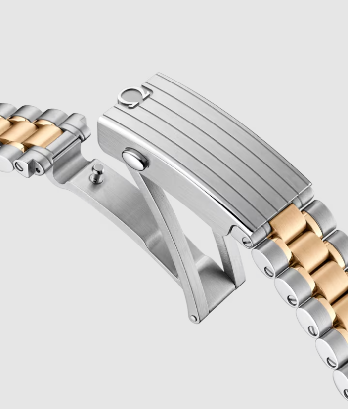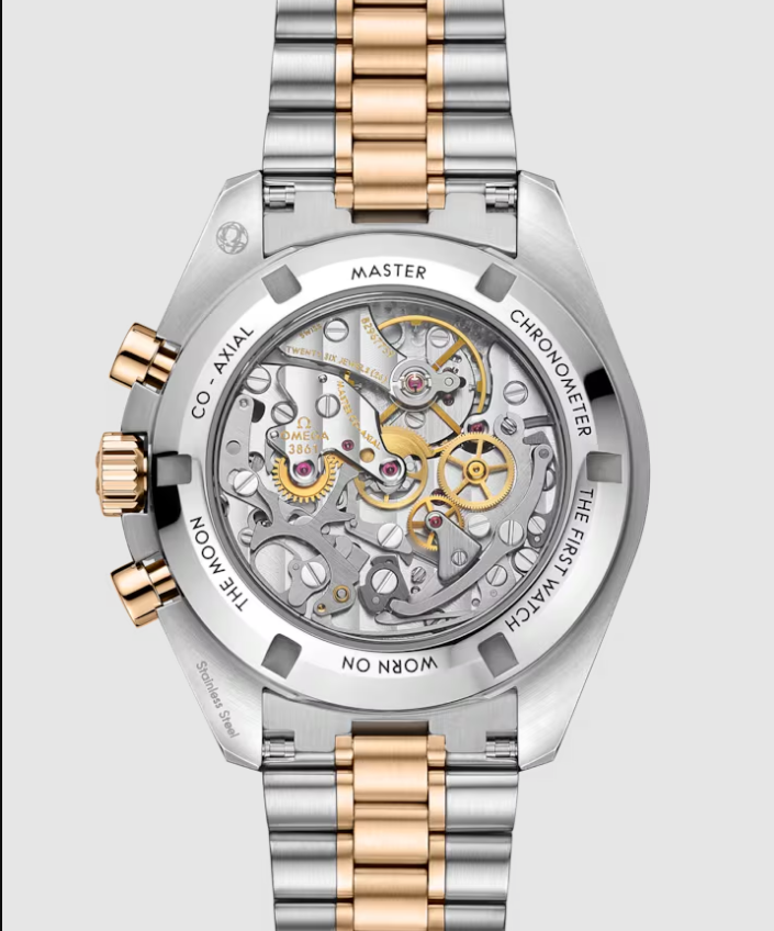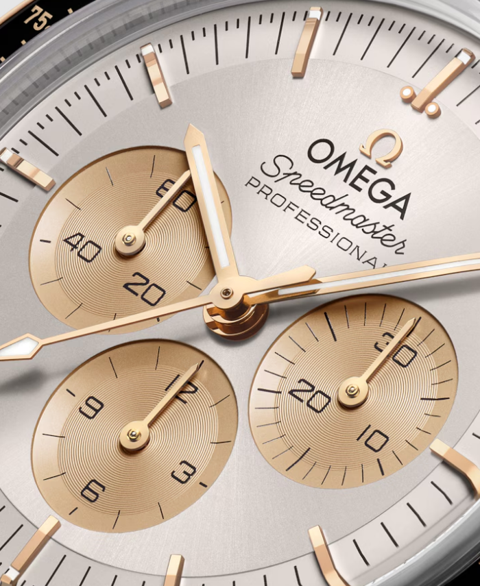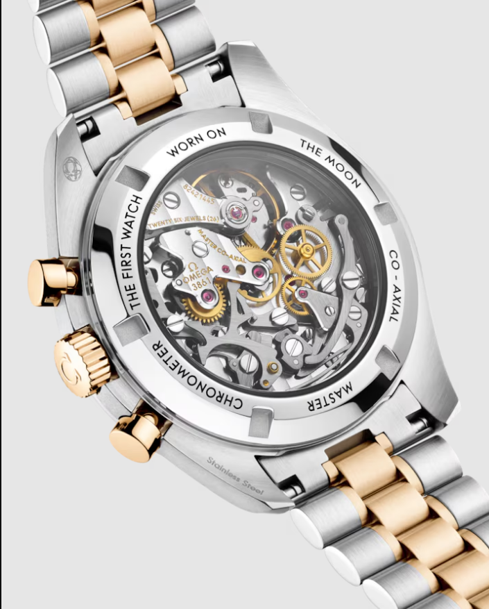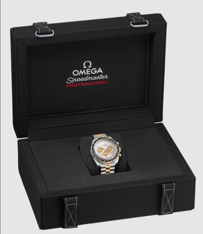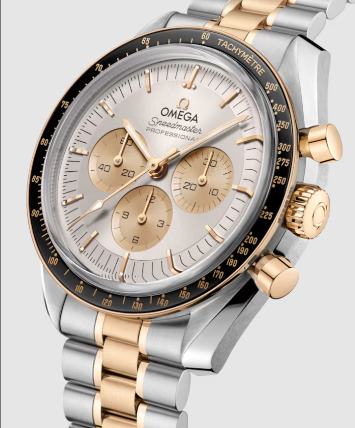 The Speedmaster Moonwatch is one of the world’s most iconic timepieces. Having been worn by astronauts on all six moon landings, the legendary chronograph is an impressive symbol of OMEGA’s pioneering spirit. This 42 mm bi-colour model in stainless steel and 18K Moonshine™ Gold features sapphire crystal glass on the front as well as on the caseback. Inspired by the 4th generation Speedmaster style worn on the moon, it includes an asymmetrical case with a black ceramic bezel ring, with its tachymeter scale and famous “dot over ninety” in OMEGA Ceragold™. The sun-brushed silvery “step” dial is presented with applied OMEGA logo and indexes, 18K Moonshine™ Gold hands, and galvanic 18K Moonshine™ Gold subdials including a small seconds recorder, 30-minute recorder, and 12-hour recorder. The watch is worn on a polished-brushed bracelet with OMEGA’s patented comfort release adjustment system, and is powered by the OMEGA Co-Axial Master Chronometer Calibre 3861. Reference 310.20.42.50.02.001 Between lugs Open Case Measurement Modal 20 mm Lug‑to‑lug Open Case Measurement Modal 47.50 mm Thickness Open Case Measurement Modal 13.18 mm Case diameter Open Case Measurement Modal 42 mm Case steel ‑ Moonshine™ gold Dial color Silver Crystal Scratch‑resistant sapphire crystal with anti‑reflective treatment inside Water resistance 5 bar (50 metres / 165 feet) Total product weight (approx.) 161 g Caliber Omega 3861 Movement type Manual‑winding Power reserve 50 hours