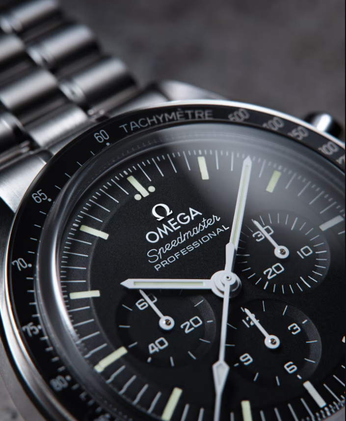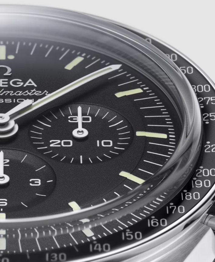 The Speedmaster Moonwatch is one of the world’s most iconic timepieces. Having been a part of all six moon landings, the legendary chronograph is an impressive representation of the brand’s adventurous pioneering spirit. Presented on a polished-brushed five-arched-links-per-row bracelet, this 42 mm Moonwatch in stainless steel features sapphire crystal glass on the front as well as on the caseback. Inspired by the 4th generation Speedmaster style worn on the moon, it also includes an asymmetrical case, black step dial with applied OMEGA logo and the famous dot over 90 on the anodised aluminium bezel ring. The watch is driven by the OMEGA Co-Axial Master Chronometer Calibre 3861, which powers the small seconds sub-dial, 30-minute recorder and 12-hour recorder, along with the central chronograph function. Reference 310.30.42.50.01.002 Between lugs Open Case Measurement Modal 20 mm Lug‑to‑lug Open Case Measurement Modal 47.50 mm Thickness Open Case Measurement Modal 13.18 mm Case diameter Open Case Measurement Modal 42 mm Case Steel Dial color Black Crystal Domed, scratch‑resistant sapphire crystal with anti‑reflective treatment inside Water resistance 5 bar (50 metres / 165 feet) Total product weight (approx.) 138 g